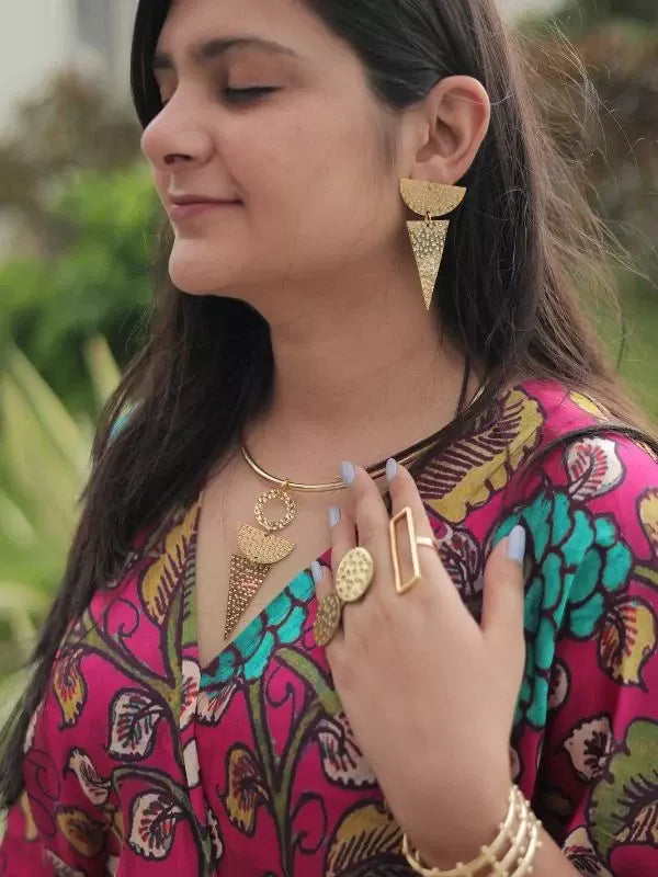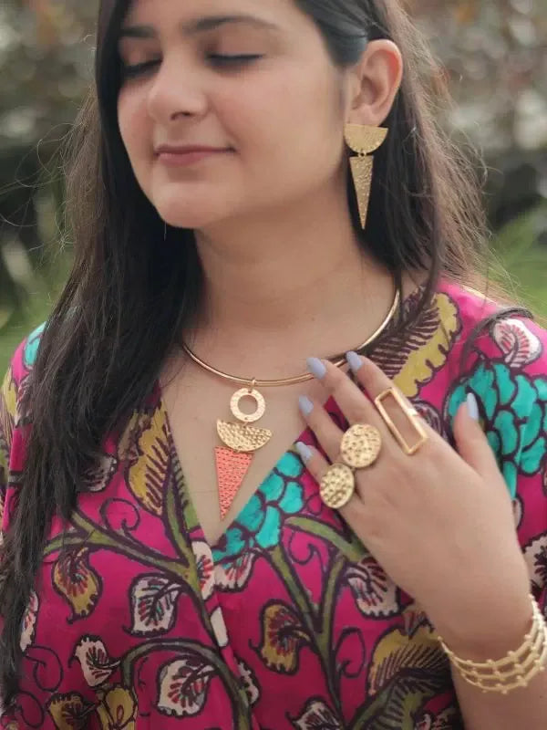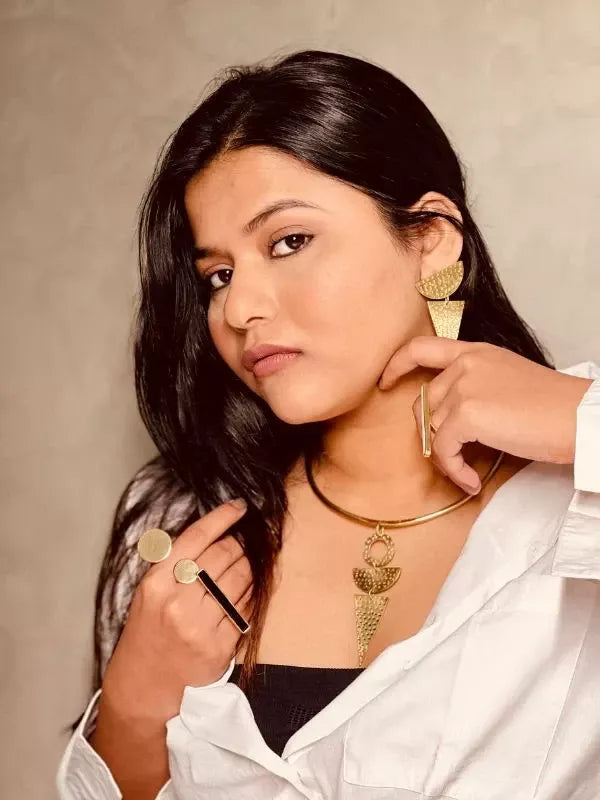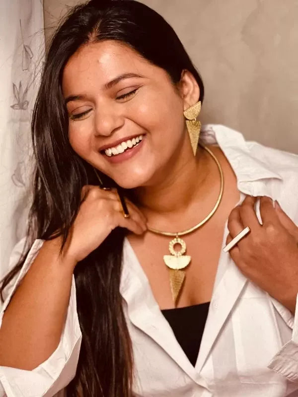 A piece that commands respect before you speak. The Hasli SemiCircle Triangle is a bold neck piece drawing on ancient hasli traditions, reimagined with geometric precision. Handcrafted in 22kt gold-plated brass - reserved for women who walk in first.